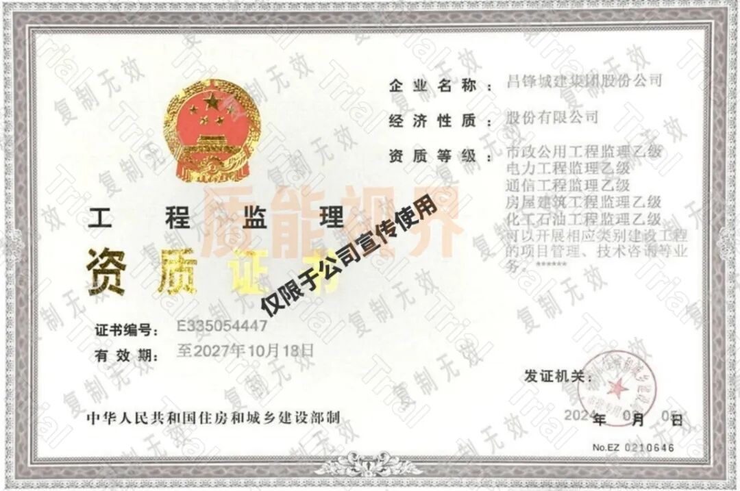 房屋建筑/电力/市政公用/石油化工/通信/公路/水利工程施工/水土保持施工+造价招标代理【昌锋城建】作者: 质能视界 / 2025年10月29日 【昌锋城建集团股份公司】 监理乙级:房屋建筑、电力、市政公用、石油化工、通信、公路、水利工程施工、水土保持施工 造价备案 招标代理/政府采购备案 版权声明:本站所有文章,如无特别说明或标注,均为本站原创发布。任何个人或组织,未经本站授权,不得以任何形式复制、转载、盗用、采集本站内容用于商业或非商业用途。如需使用,请联系站长获取授权。
