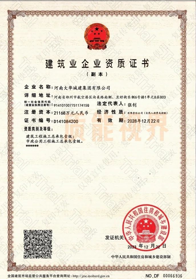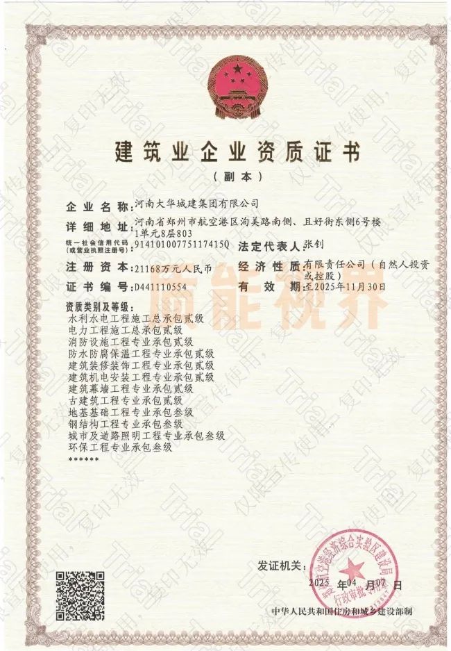 市政/建筑工程施工总承包一级资质加盟分公司【河南大华城建】 2025年11月11日2025年8月21日 作者 质能视界 河南大华城建集团有限公司 总包一级:建筑、市政 总包二级:水利水电、电力 专包二级:防水防腐保温、建筑装修装饰、建筑幕墙、古建筑、消防设施、建筑机电安装、钢结构、城市及道路照明、环保、地基基础