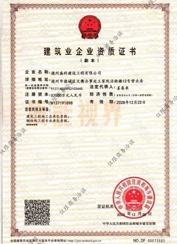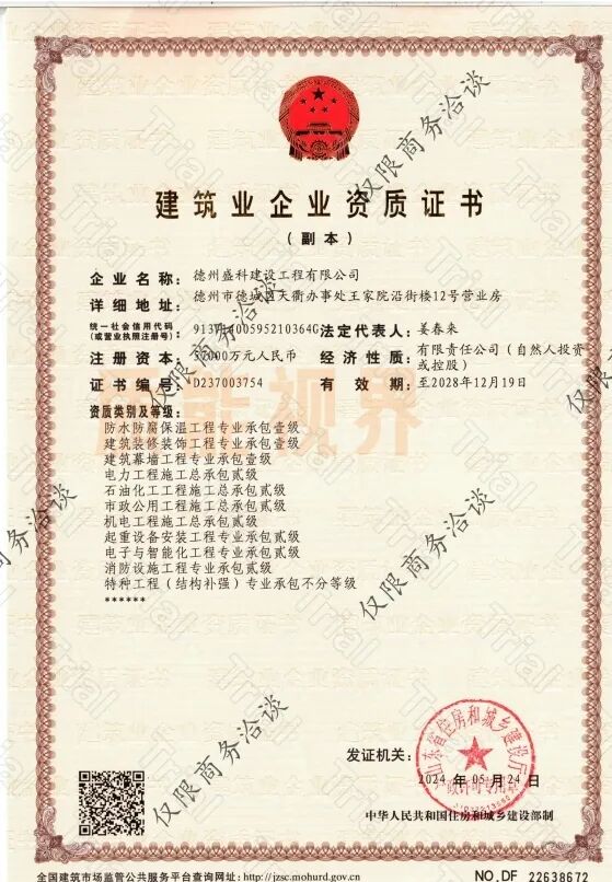 建筑/钢结构/防水防腐保温/建筑装修装饰/建筑幕墙施工一级资质加盟【德州盛科建设】作者: 质能视界 / 2025年10月29日 【德州盛科建设工程有限公司】 总包一级:建筑 专包一级:钢结构、防水防腐保温、建筑装修装饰、建筑幕墙 总包二级:市政公用、电力、机电工程、石油化工 专包二级:起重设备安装、电子与智能化、消防设施 不分等级:特种工程(结构补强) 版权声明:本站所有文章,如无特别说明或标注,均为本站原创发布。任何个人或组织,未经本站授权,不得以任何形式复制、转载、盗用、采集本站内容用于商业或非商业用途。如需使用,请联系站长获取授权。