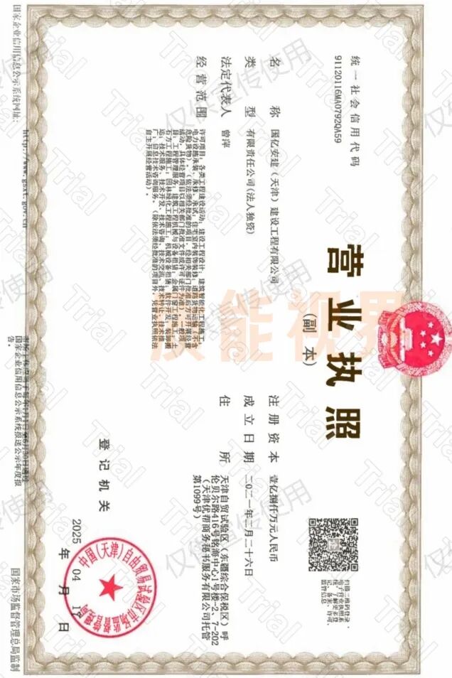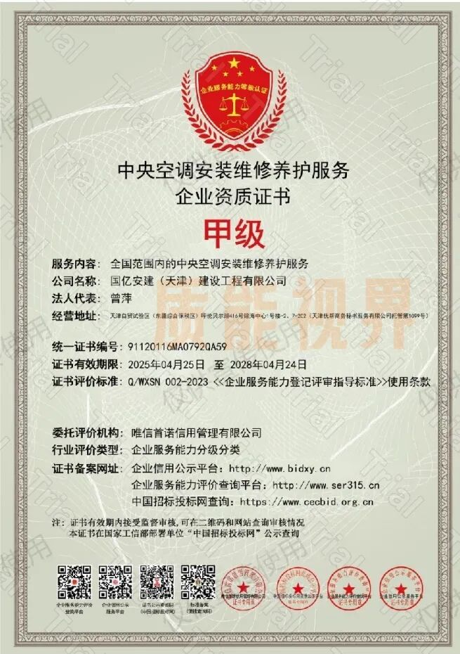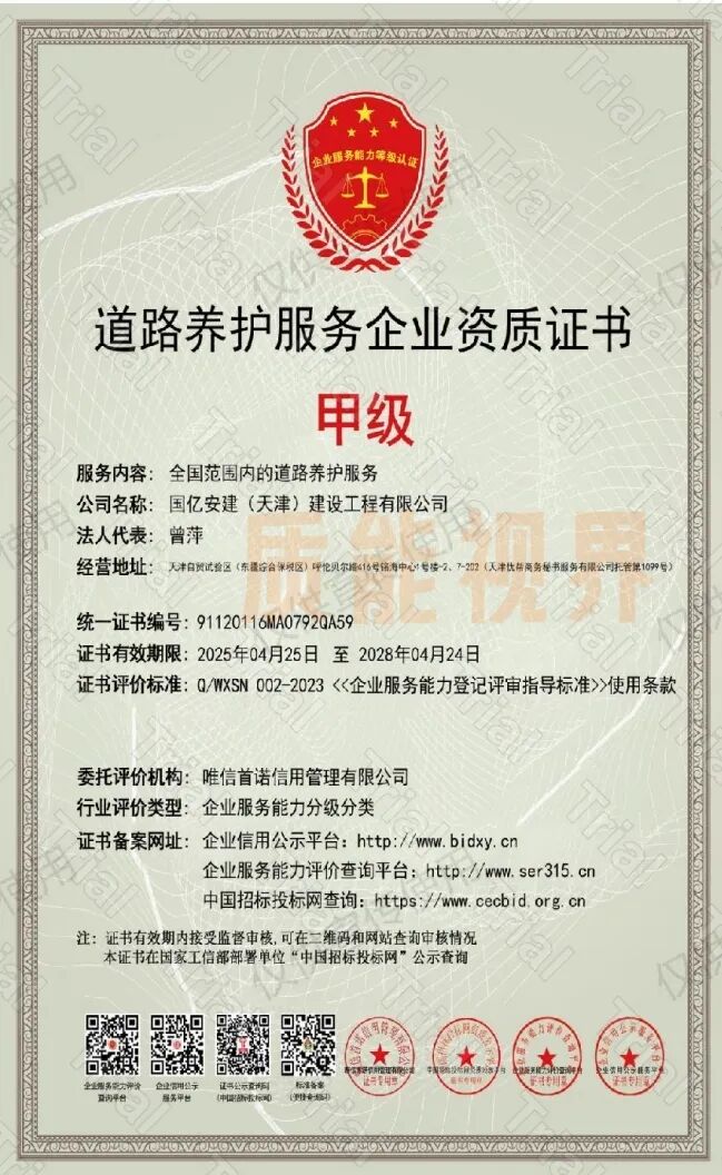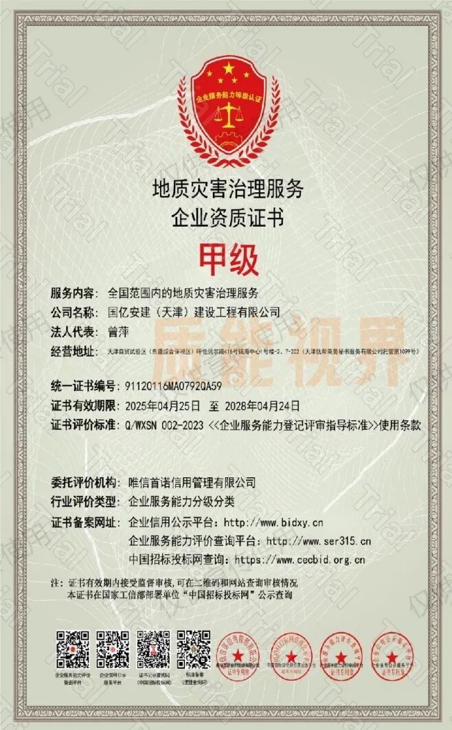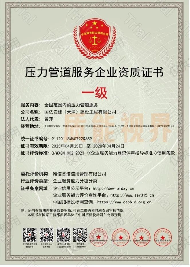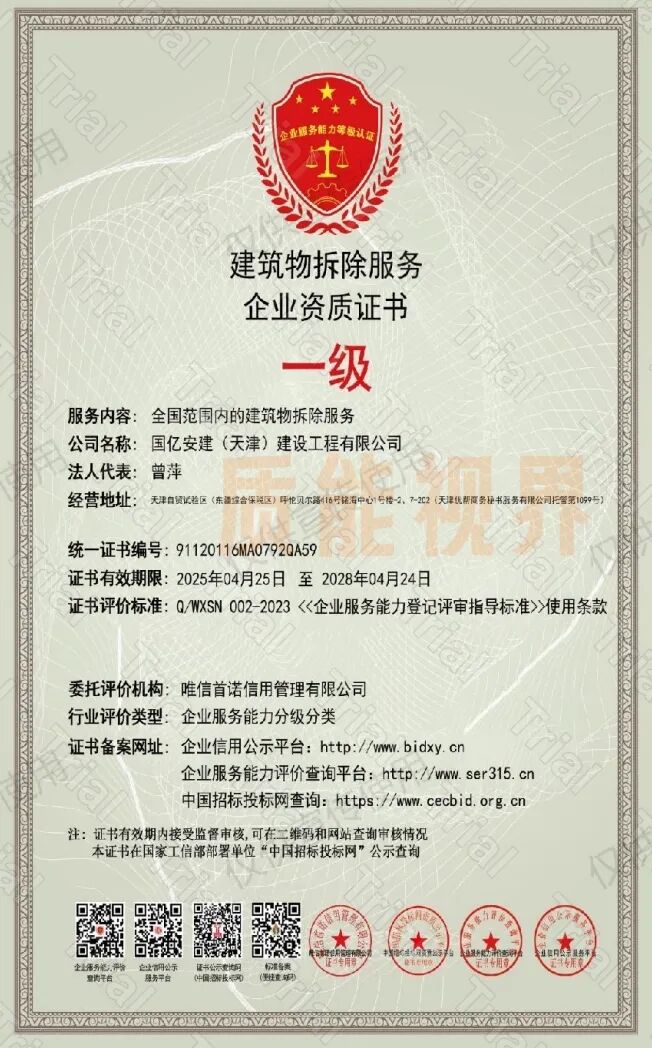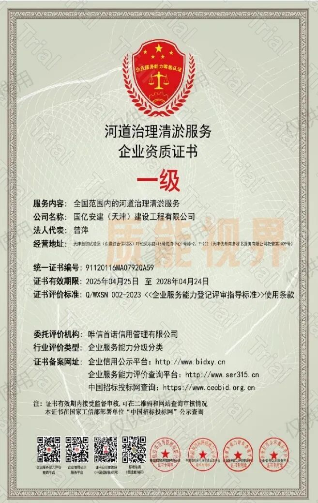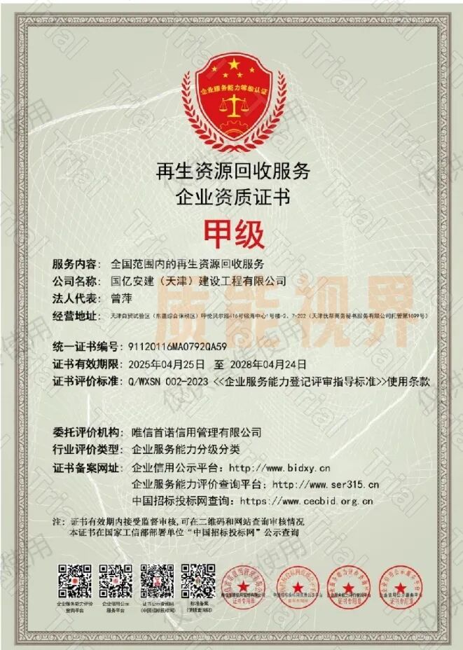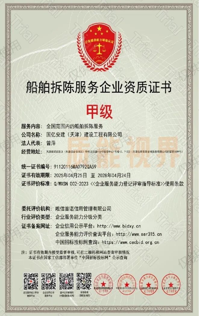 企业服务资质甲级:再生资源回收服务、压力管道服务、石油化工拆除服务、建筑物拆除服务、河道治理清淤服务、地质灾害治理服务、道路养护服务、船舶拆除服务、中央空调安装维修养护服务