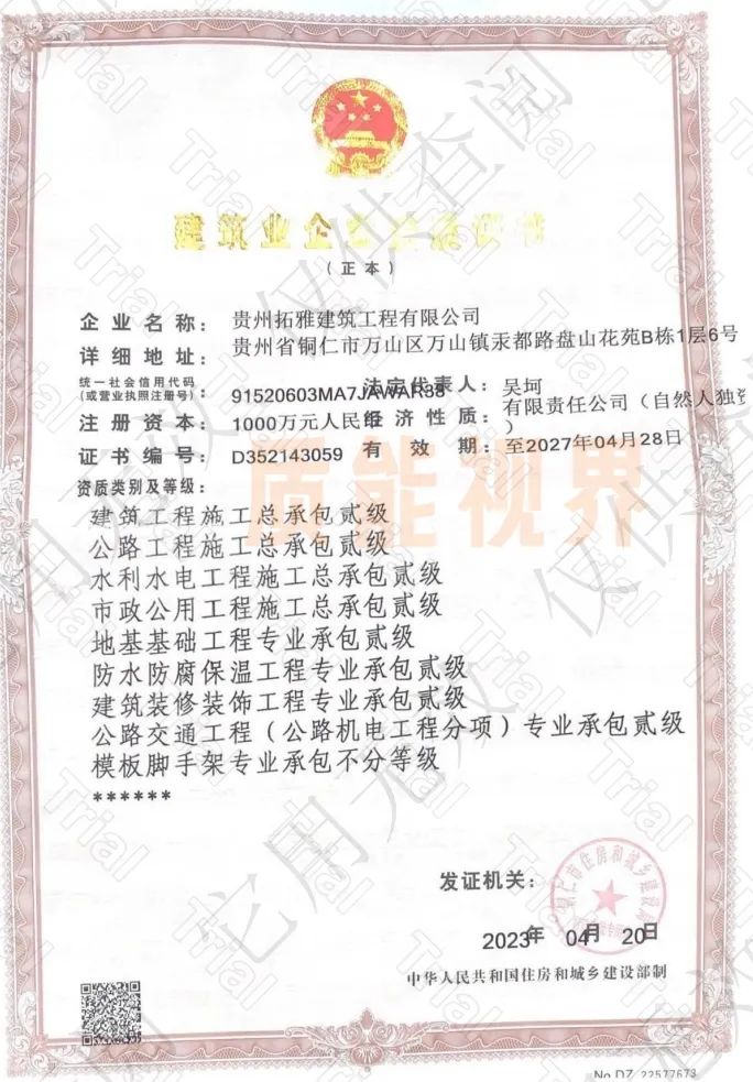 公路/水利水电/建筑/市政公用施工资质加盟【贵州拓雅建筑】作者: 质能视界 / 2025年7月24日 总包二级:公路、水利水电、建筑、市政公用 专包二级:防水防腐保温、建筑装修装饰、地基基础、公路交通工程(公路机电工程) 不分等级:模板脚手架 版权声明:本站所有文章,如无特别说明或标注,均为本站原创发布。任何个人或组织,未经本站授权,不得以任何形式复制、转载、盗用、采集本站内容用于商业或非商业用途。如需使用,请联系站长获取授权。