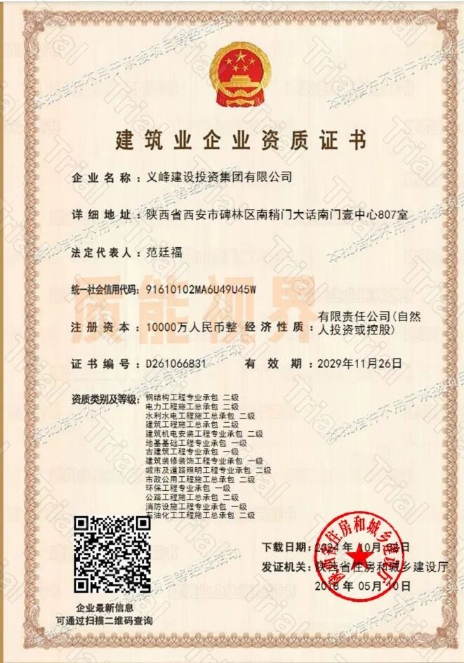 专包二级:建筑机电安装、城市及道路照明、钢结构、建筑幕墙、电子与智能化、防水防腐保温